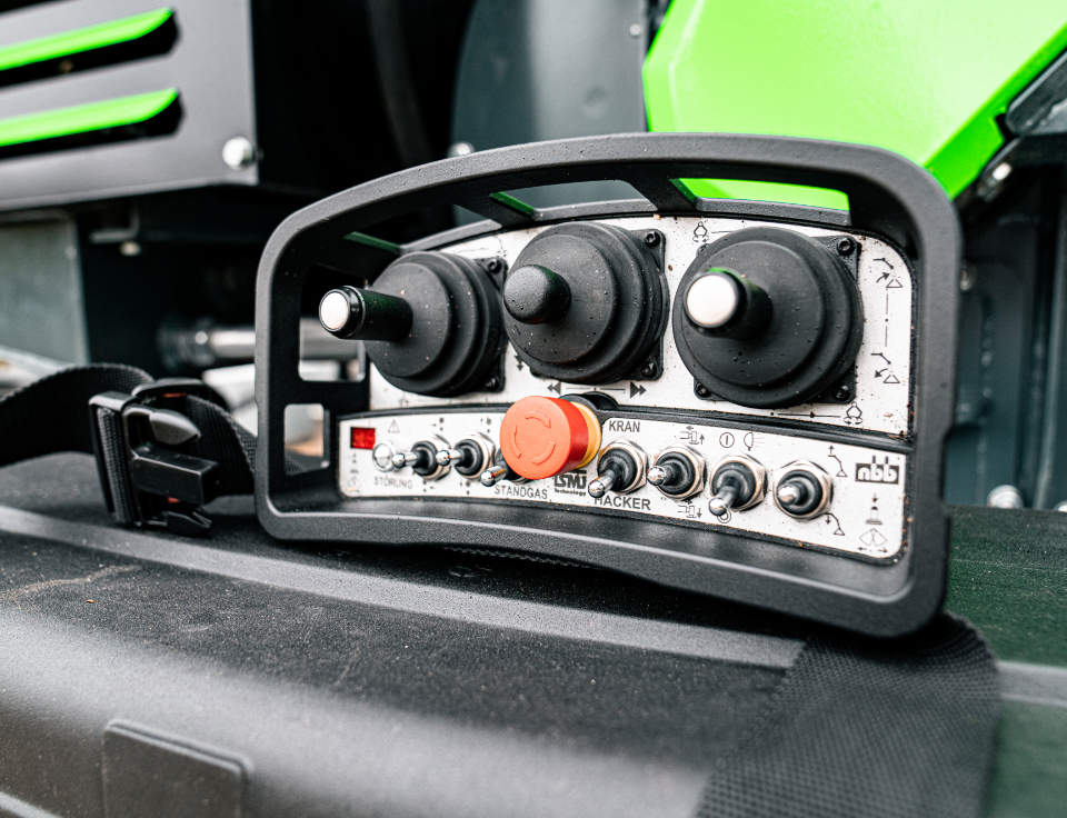 Mit seinem in der Maschinenmitte positionierten 420° drehbaren Z-Kran und dem 360°-Maschinendrehkranz kann er Stämme und Äste aus jeder Position aufnehmen. Alles wird per Funk bedient.