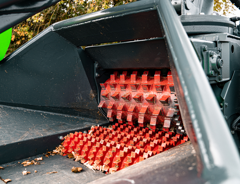 Der am Walzenteppich abgesonderte Schmutz sowie Steine werden mit einer Förderschnecke unterhalb der Hacktrommel zum Hackgut transportiert. Das hält die Messer schön scharf und schützt sie vor schnellem Verschleiß. Das Hackgut wird über das Auswurfrohr zielgenau auf den Anhänger befördert.